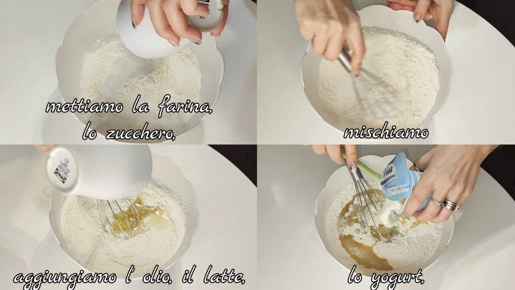 En un recipiente ponemos la harina, el azúcar y mezclamos. Añadimos el aceite, la leche, el yogur.