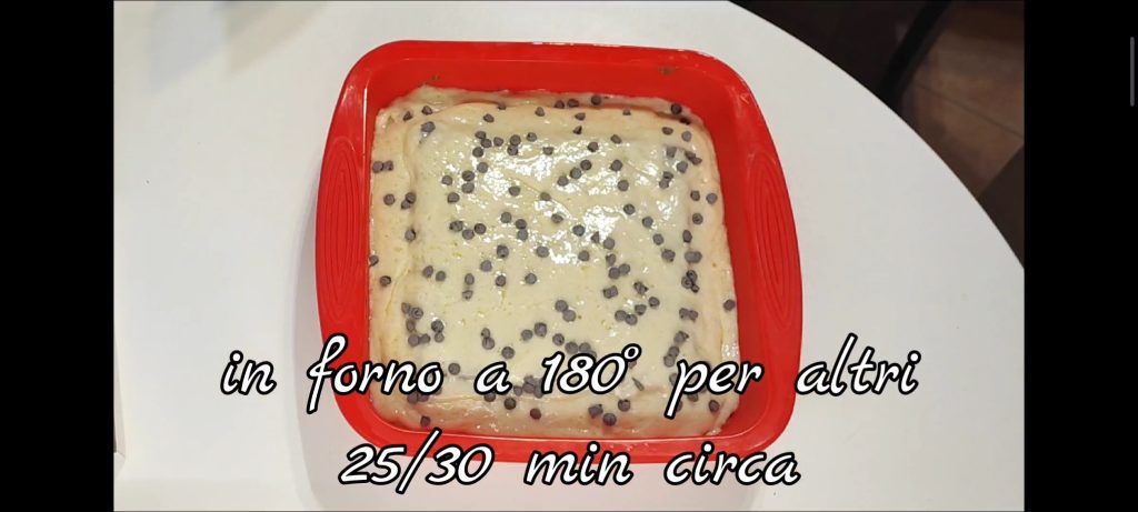 Cocemos a 180° durante unos 10 minutos. Sacamos del horno y colocamos inmediatamente las barritas de chocolate encima en fila dejando los bordes vacíos. Cubrimos con la mitad restante de la mezcla. Espolvoreamos y nivelamos bien. Añadimos un poco de gotas de chocolate encima.
