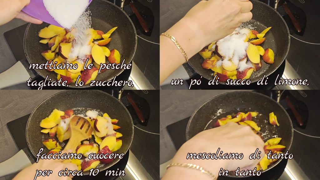 En una cacerola ponemos los melocotones cortados, el azúcar, un poco de zumo de limón y cocinamos durante unos 10 minutos, removiendo de vez en cuando.