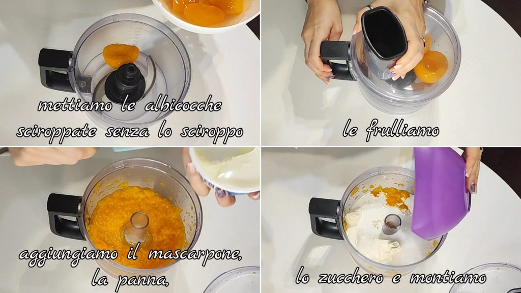 Primero, ponemos los melocotones en almíbar sin el almíbar y los trituramos. Añadimos el mascarpone, la nata, el azúcar y montamos.