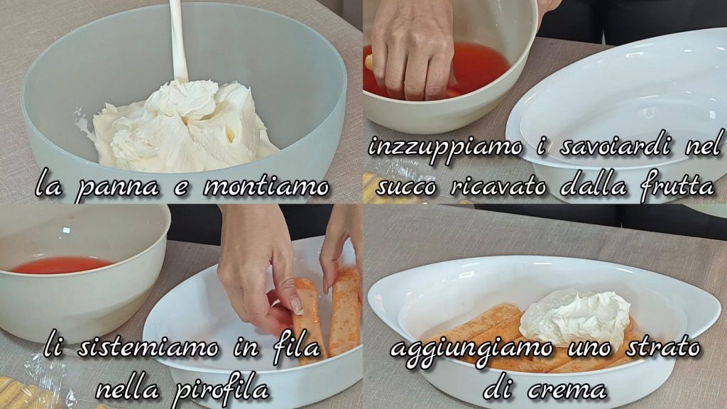 Añadimos la nata y montamos. Mojamos los bizcochos de soletilla en el jugo de la fruta y los colocamos en la fuente. Añadimos una capa de crema.