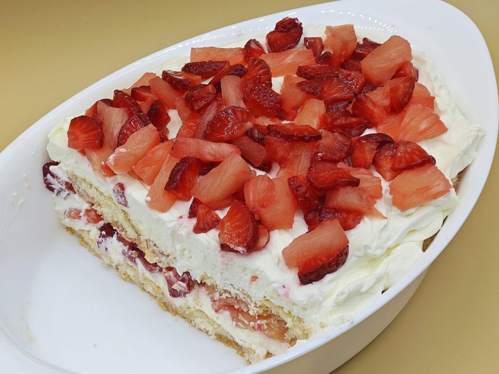 Un postre fresco y delicioso perfecto en cualquier circunstancia, ya sea para una comida sencilla o para ocasiones importantes como Pascua, etc. Si te gustan las fresas y la piña, prueba este tiramisú, no te arrepentirás. Esta receta es muy simple y rápida, se prepara en pocos minutos sin cocción y se puede hacer con mucha antelación, de hecho, si se prepara el día anterior es aún más sabroso!