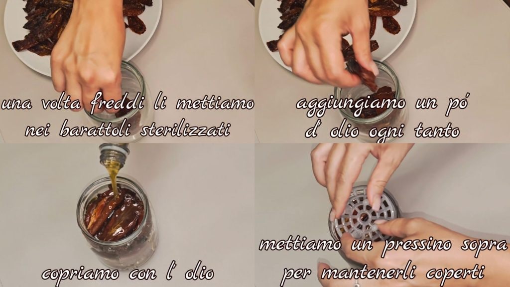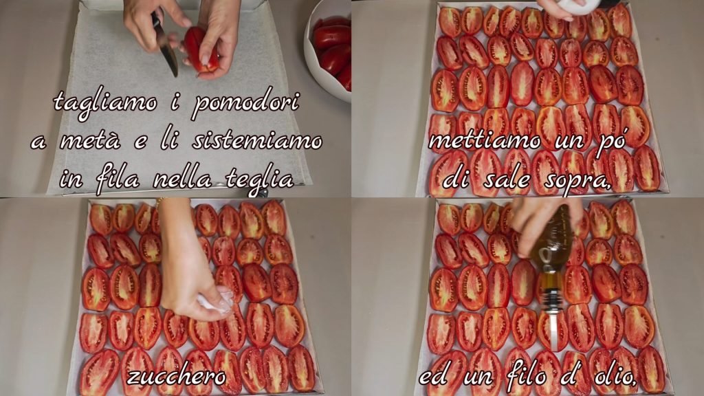 Una conserva preciada que prevé el secado de los tomates y luego puestos en aceite con varias especias para conservarlos por mucho tiempo. La receta tradicional prevé un secado lento al sol durante varios días, pero no todos tenemos los espacios adecuados y la «paciencia» para seguir este procedimiento, (como yo por cierto 😂) entonces he probado a hacerlos al horno y debo decir que no me lo esperaba pero han salido una MARAVILLA 🤩. Mi consejo, dado que durante el día hace mucho calor, es hacer esta receta por la noche, antes de ir a dormir, y por la mañana deberían estar ya listos. Si tenéis tomates del huerto, aún mejor, ¡el resultado será extraordinario!
