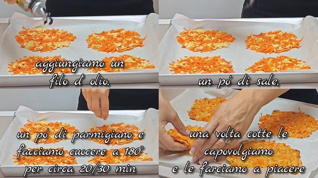 Una receta de verano muy versátil que podemos adaptar según nuestras necesidades. He hecho unas mini tortillas con zanahorias y scamorza y luego las he rellenado con embutidos y quesos al gusto. Un plato perfecto para las noches de verano si queremos preparar una cena ligera y apetitosa o una idea para el almuerzo para llevar a la playa o a la oficina, en fin, ¡esta receta es perfecta en cualquier circunstancia!