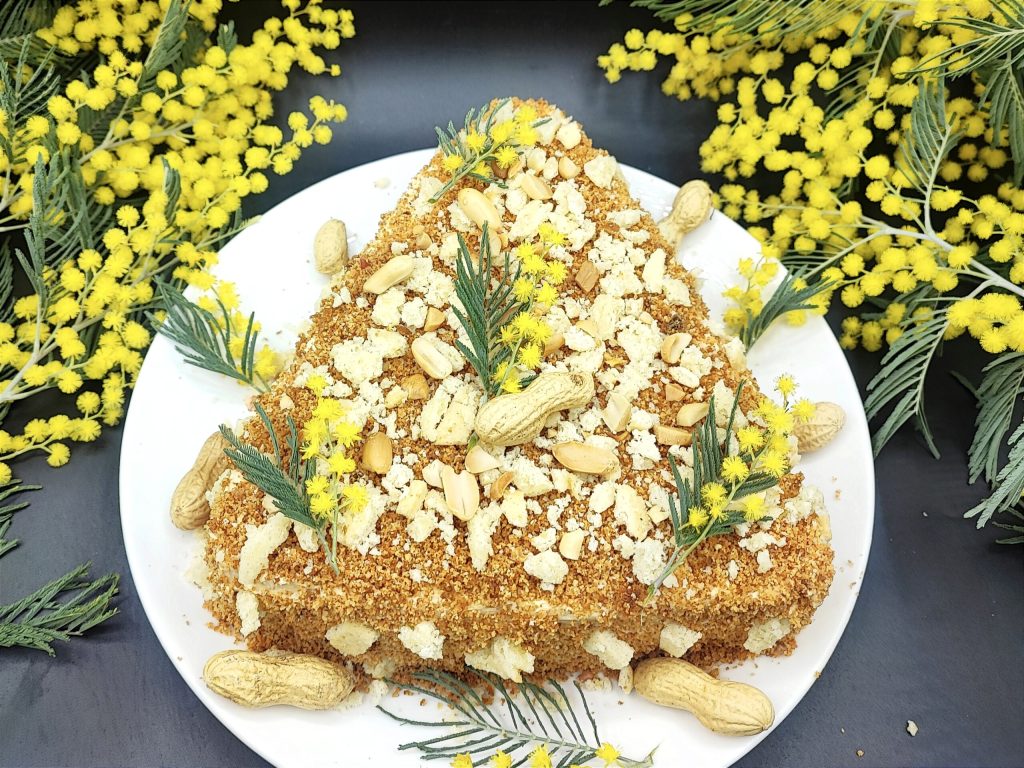 Una tarta mimosa en forma triangular con una base hecha con harina y nata, rellena con una crema de caramelo y enriquecida con un poco de cacahuetes. Una receta muy fácil de preparar y excelente para servir como postre al final de la comida y no solo.