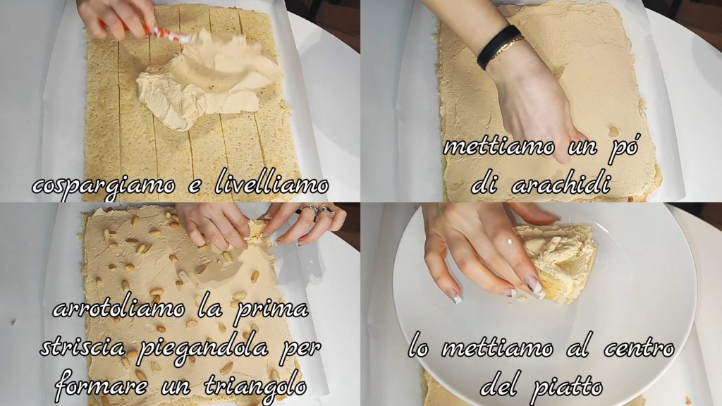 Espolvoreamos y nivelamos. Ponemos un poco de cacahuetes encima. Enrollamos la primera tira doblándola, la ponemos en el centro del plato.