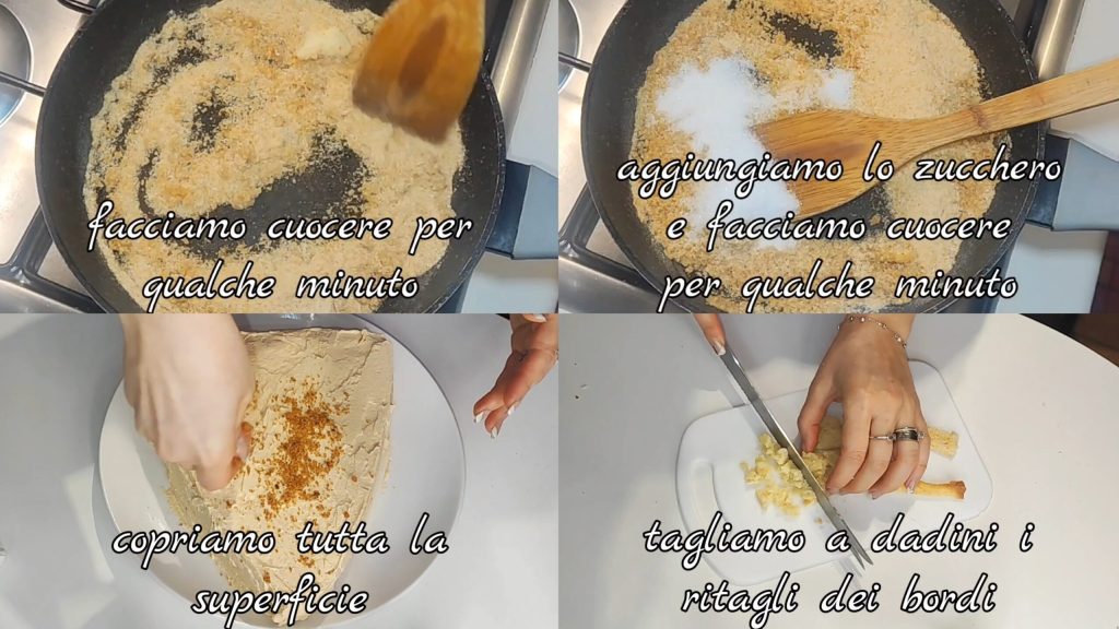 Cocemos durante unos minutos. Ponemos el azúcar y cocemos por unos minutos más. Apagamos y dejamos enfriar, luego cubrimos toda la tarta. Cortamos en cubitos los recortes de los bordes.
