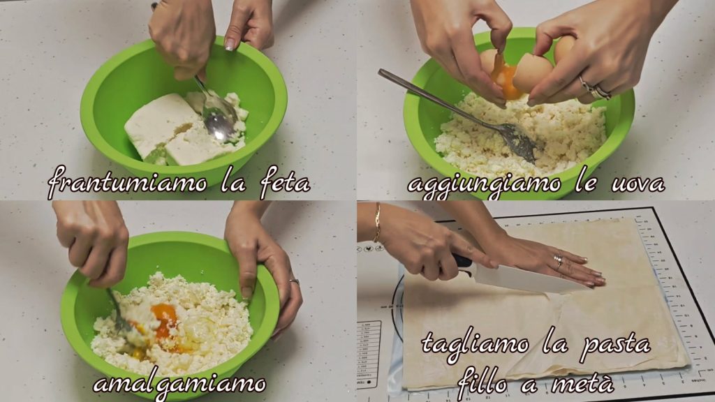 Desmenuza la feta y luego añade los huevos y mezcla. Corta las hojas de pasta filo por la mitad
