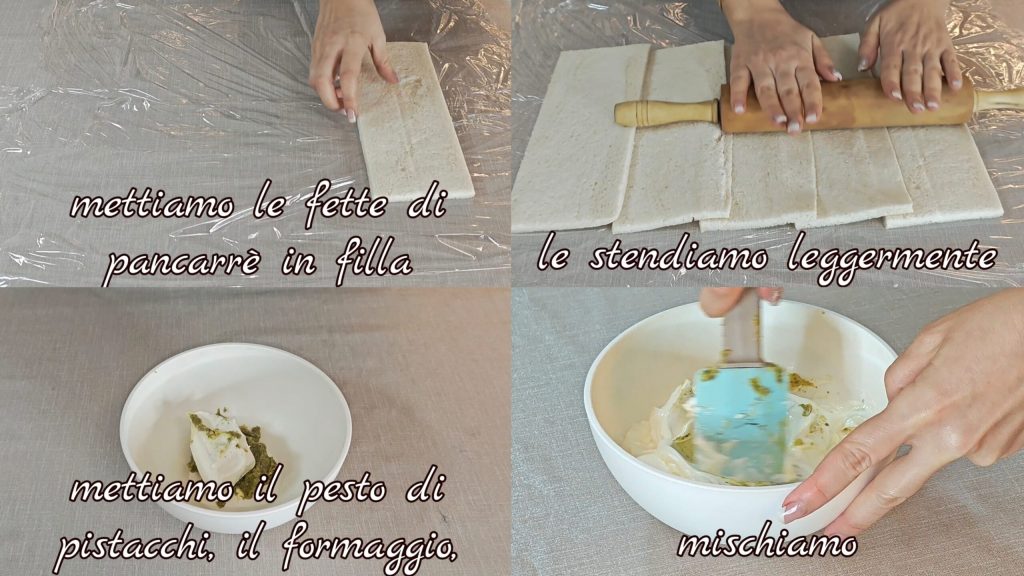 Primero ponemos en fila las rebanadas de pan de molde sobre el film y las estiramos ligeramente usando un rodillo. En un recipiente ponemos el pesto de pistachos, la crema de queso y mezclamos.