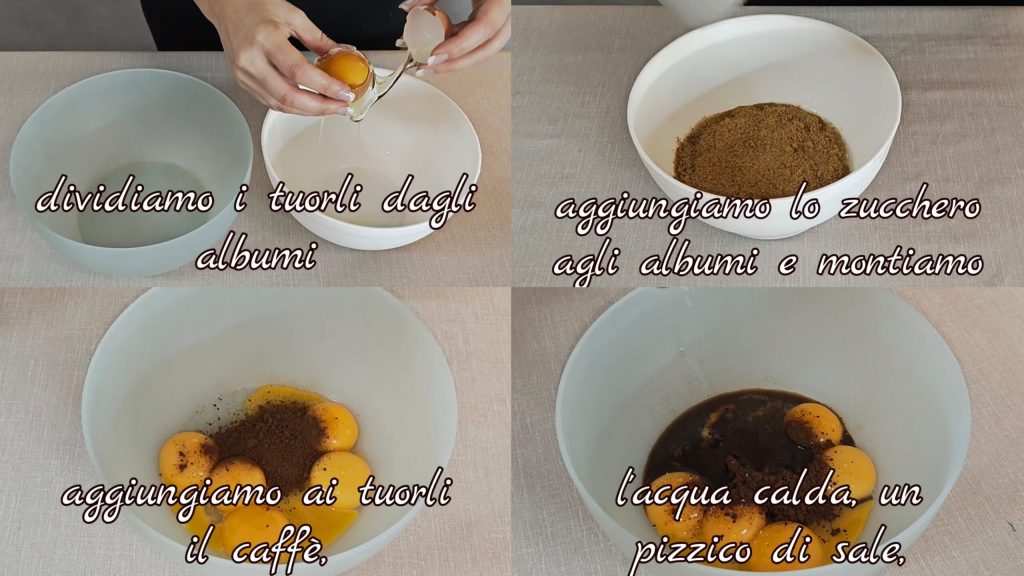 Separamos las yemas de las claras. Añadimos el azúcar a las claras y montamos. Unimos a las yemas el café soluble, el agua caliente, una pizca de sal