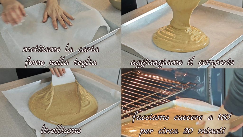 Ponemos papel de horno en la bandeja, añadimos la mezcla. La esparcimos y nivelamos. Cocinamos a 180° durante unos 20 min.