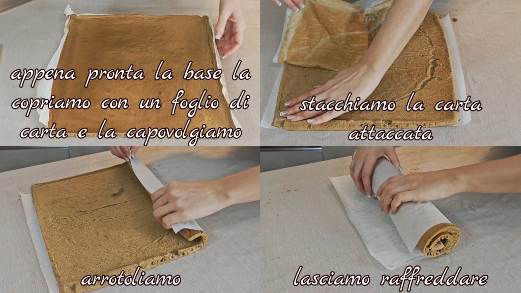 Apenas esté lista la base, la cubrimos con otra hoja de papel y la volteamos, luego retiramos el papel de horno que se pegó durante la cocción y enrollamos. Dejamos enfriar bien