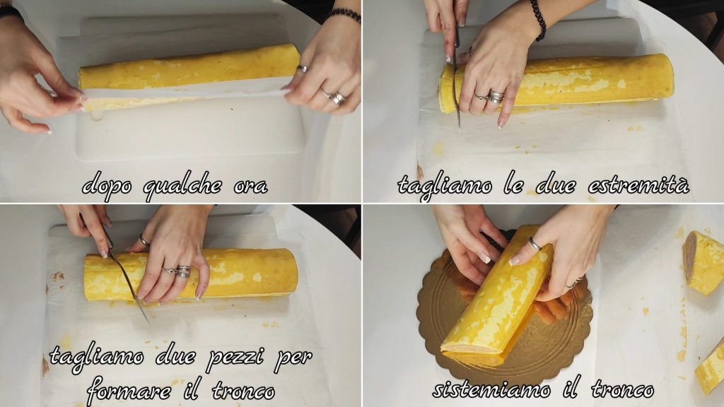 Después de unas horas sacamos el rollo de la nevera, cortamos los dos extremos y luego cortamos dos piezas para formar el tronco. Colocamos las piezas a gusto.