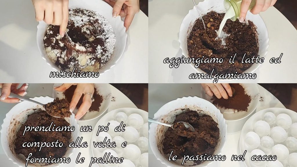 Mezclamos para obtener una mezcla homogénea. Añadimos la leche y mezclamos bien (si es necesario, se puede añadir un poco más de leche). Tomamos un poco de mezcla y modelamos con las manos para dar forma a las bolitas. Las pasamos por el cacao.