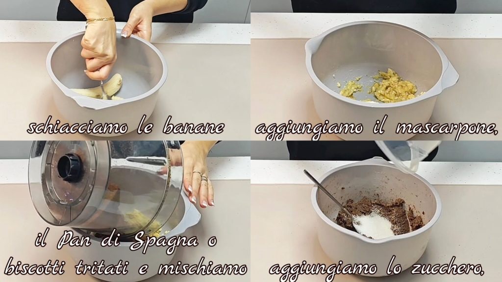 Tritura los plátanos, añade el mascarpone y el bizcocho o las galletas trituradas y mezcla. Añade el azúcar