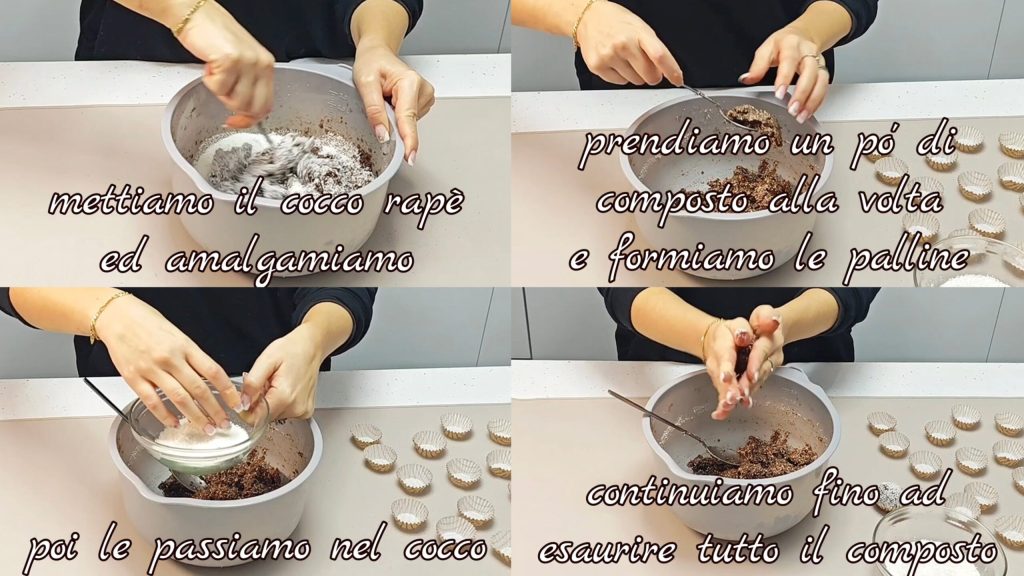 Agrega el coco rapé y mezcla bien hasta obtener una masa homogénea. Toma un poco de masa cada vez y modela con las manos para formar bolitas, luego pásalas por el coco y colócalas en capacillos de papel.