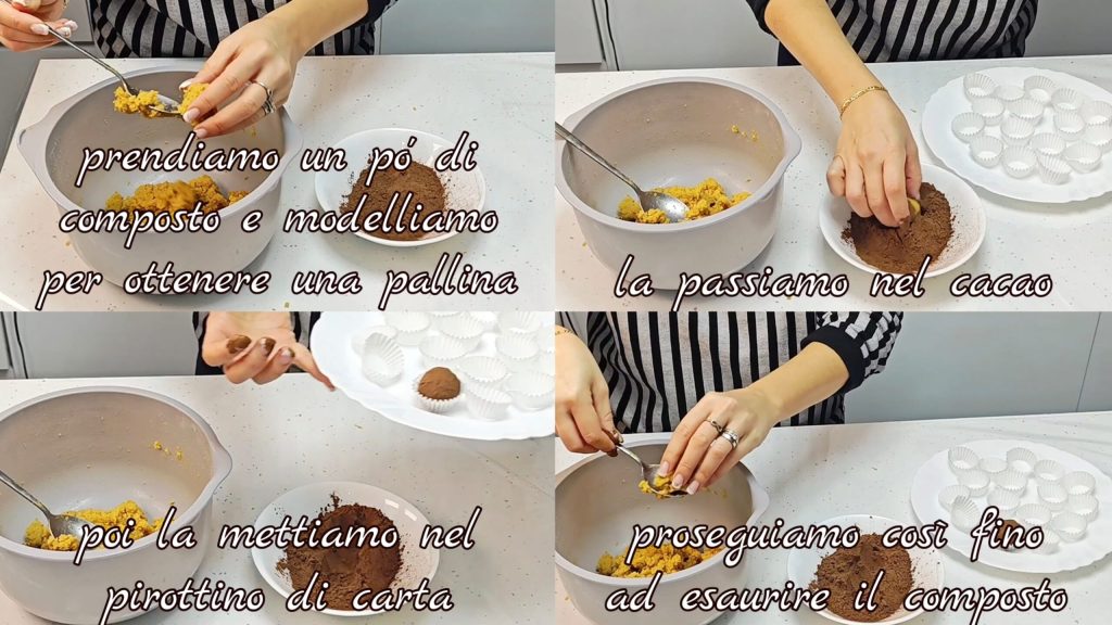 Tomamos un poco de mezcla con las manos y modelamos para obtener bolitas (del tamaño deseado), luego las pasamos por el cacao y las colocamos en los moldes de papel. Continuamos así hasta agotar toda la mezcla.