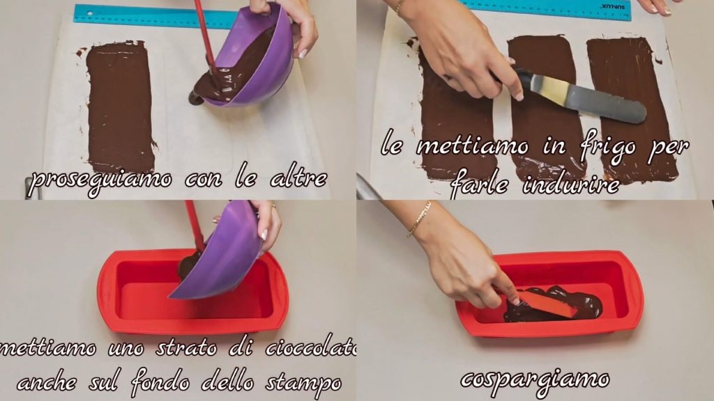 Ponemos las siluetas en la nevera o congelador por unos minutos para endurecer el chocolate. Ponemos una capa fina de chocolate (el que ha sobrado) en el fondo del molde forrado con film o utilizamos un molde de silicona.