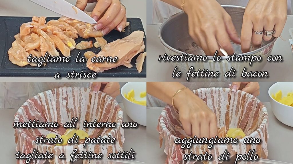 Corta la pechuga de pollo en tiras bastante finas. Pela y corta las patatas en rodajas muy finas, mejor si usas una mandolina para obtener un grosor uniforme. Toma un molde en forma de cúpula. Cúbrelo completamente con las lonchas de bacon, comenzando desde el centro y colocándolas alrededor para crear la base y los bordes. Deja los extremos del bacon un poco largos, así podrás doblarlos al final. Coloca dentro una capa de patatas, una capa de pollo,