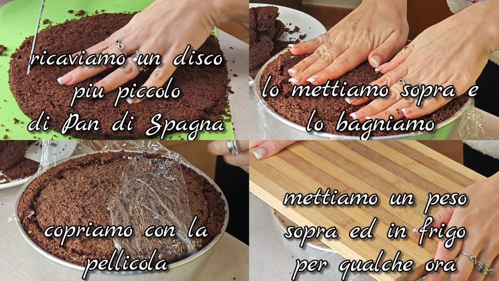 Sacamos un disco de bizcocho más pequeño y lo ponemos encima, lo mojamos. Cubrimos con el film y ponemos un peso encima y en la nevera durante algunas horas.
