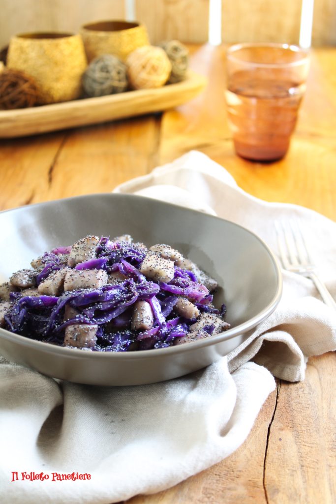 Cuando los gnocchetti estén listos, escurridlos en la sartén con la col lombarda y salteadlos para darles sabor, añadiendo si es necesario un poco de agua de cocción de la pasta y un chorrito de aceite de oliva virgen extra.