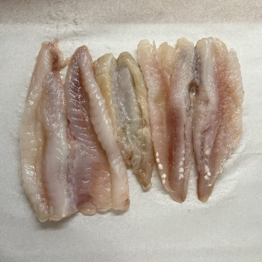 Abre cada filete de rape en forma de libro y coloca todos los filetes uno al lado del otro sobre una hoja de papel de horno