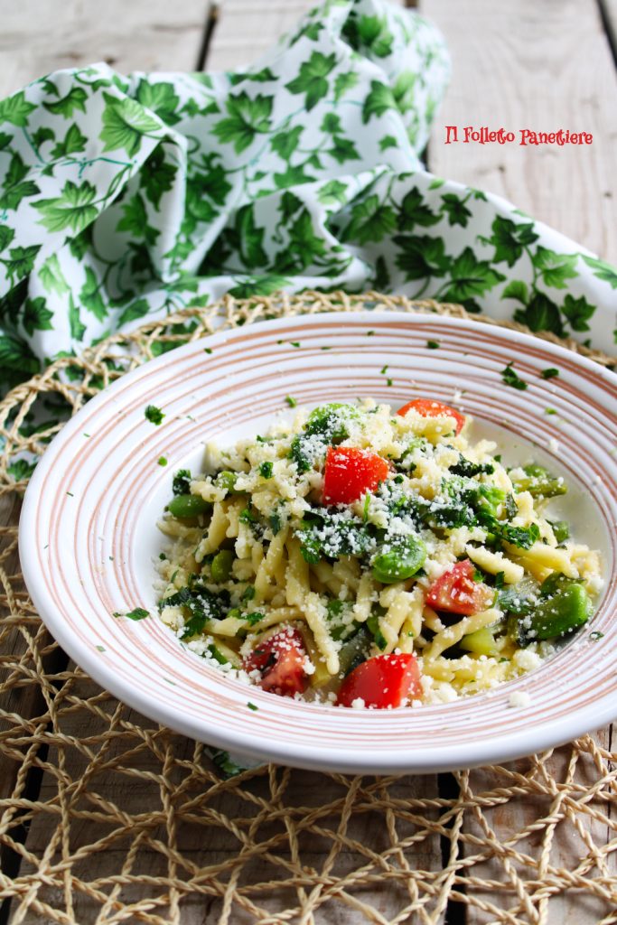 Sirve inmediatamente las trofie con habas y achicoria con una generosa pizca de pecorino rallado.