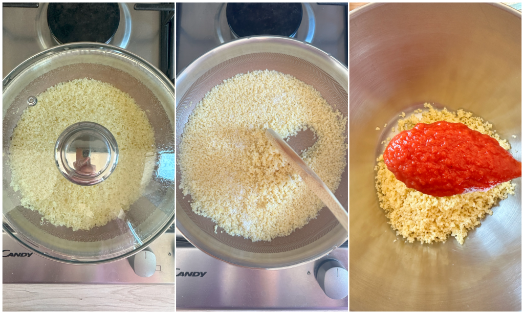 Para preparar el cuscús gratinado con tomate en freidora de aire, lo primero que tienes que hacer es preparar el cuscús. Pon en una olla 90 g de agua (normalmente se pone la misma cantidad de agua que de cuscús, a mí me gusta más suave), añade el aceite y la sal y lleva a ebullición. Apaga el fuego, añade el cuscús, cubre con una tapa y deja reposar durante 5 minutos. Desgrana el cuscús con un tenedor y transfiérelo a un bol. Añade el puré de tomate.