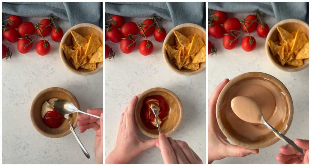 Para preparar la salsa rosa pon en un bol la mayonesa, añade el ketchup y luego 4 gotas de salsa Worcestershire.