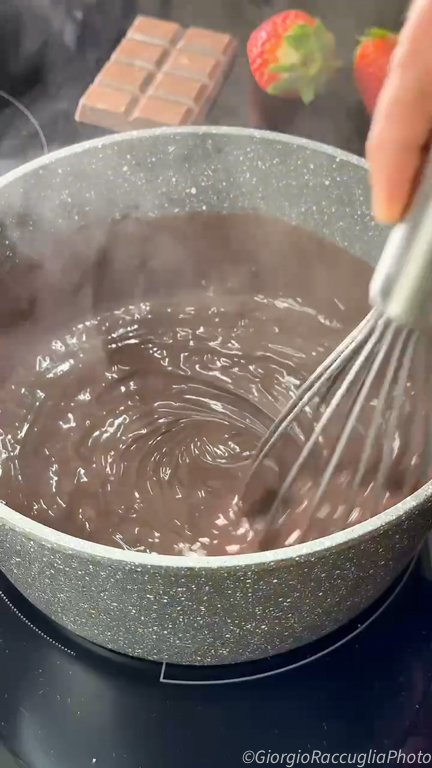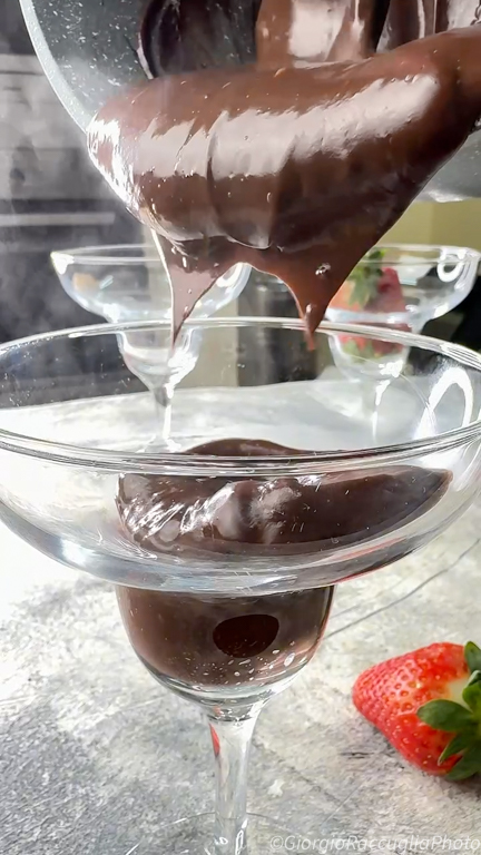 La base es una crema de cacao densa y aterciopelada, sin huevos y sin mantequilla, que se hace en la cocina mezclando apenas. Una vez fría, se convierte en lo más delicioso que puedes poner en un vaso. Con nata montada por encima y una fresa fresca, tienes un postre para aplaudir.