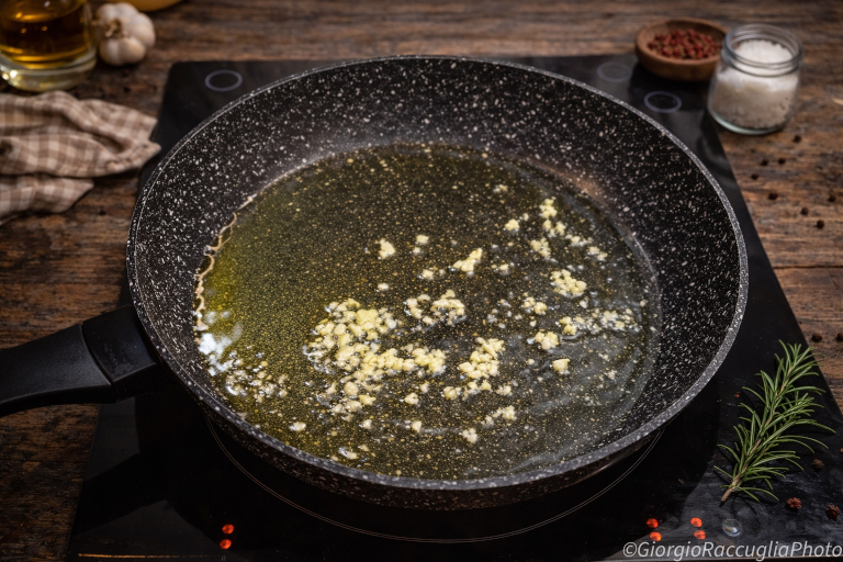 En una sartén amplia calienta el aceite de oliva virgen extra y dora suavemente el diente de ajo picado.