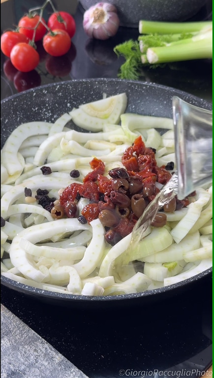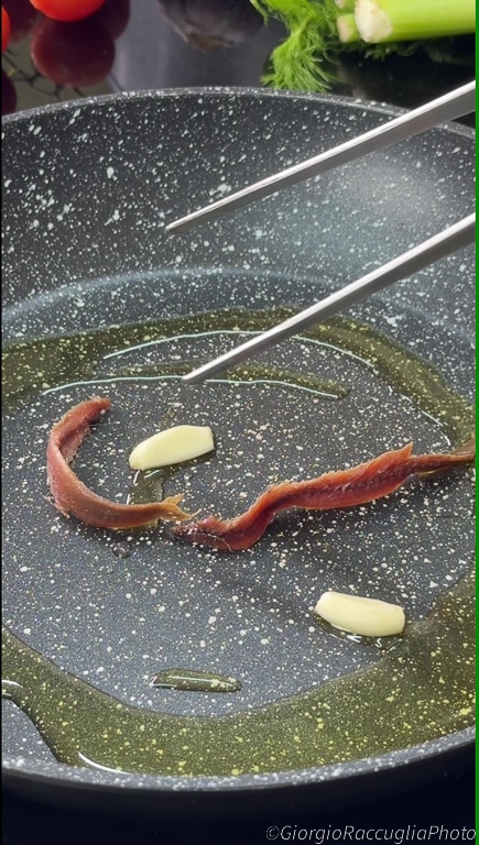 Ahora prepara los hinojos: añade un chorrito de aceite en la sartén y agrega 2 dientes de ajo,