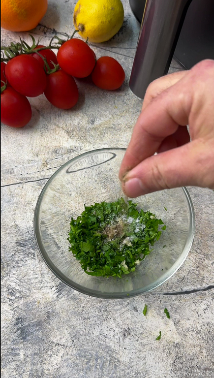 En un bol, prepara la marinada mezclando perejil picado,
