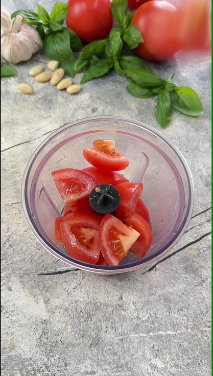 Para preparar la pasta fría con pesto a la trapanesa, empieza con poner la pasta en abundante agua con sal y mientras tanto prepara el pesto. Corta los tomates de manera gruesa.
