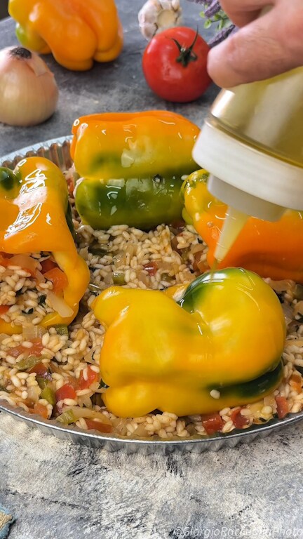 Los pimientos rellenos de arroz son un gran clásico de la cocina mediterránea: un plato colorido, ligero y lleno de sabor. Esta receta es ideal como segundo vegetariano o como plato único, perfecto para llevar a la mesa en los días de verano, pero delicioso en cualquier estación. Prepararlos es sencillo y el resultado conquista a todos gracias al contraste entre la dulzura de los pimientos y el relleno suave y aromático de arroz y verduras.