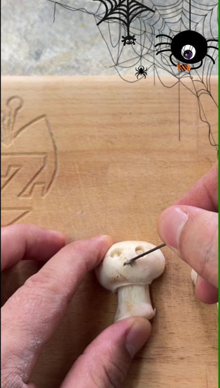 • Con la pajita haz dos agujeros en la parte superior de los champiñones: estos serán los ojos.