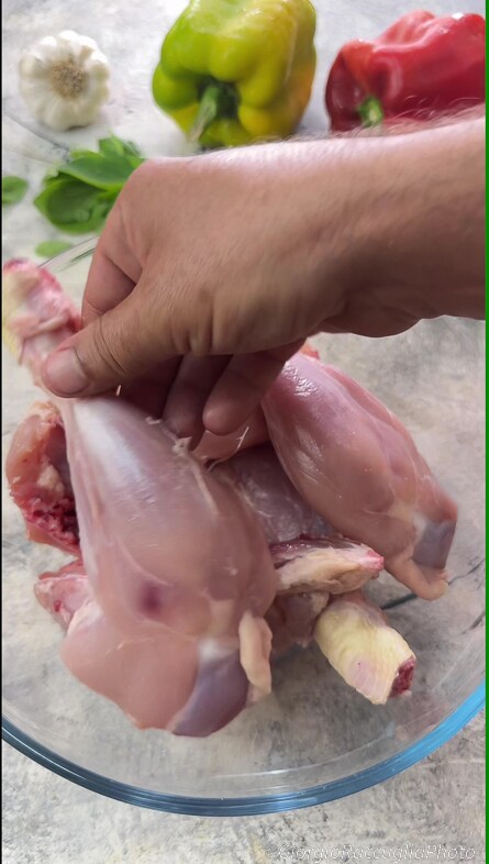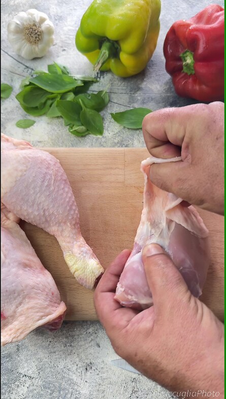Para preparar el pollo y pimientos en sartén, comienza por quitar la piel del pollo.