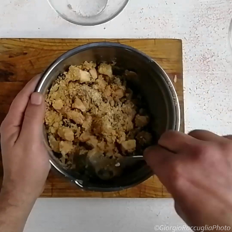 y mezcla todo con una cuchara hasta obtener una mezcla homogénea. El relleno debe estar húmedo pero no pegajoso: si hace falta, añade otro chorrito de aceite.