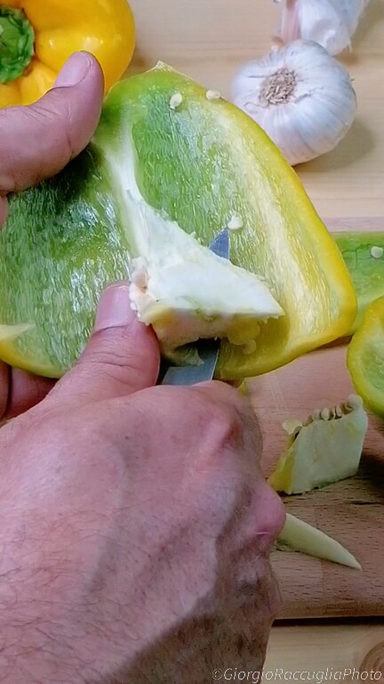 Para preparar la receta de fettuccine con pesto de pimientos, comienza limpiando y cortando los pimientos,