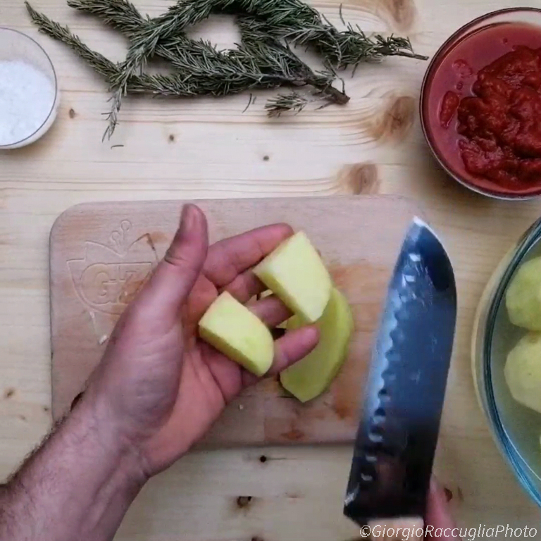 Para preparar la receta de salchichas y patatas a la pizzaiola, empieza pelando las patatas, colócalas en un bol con agua durante 30 minutos y después de secarlas