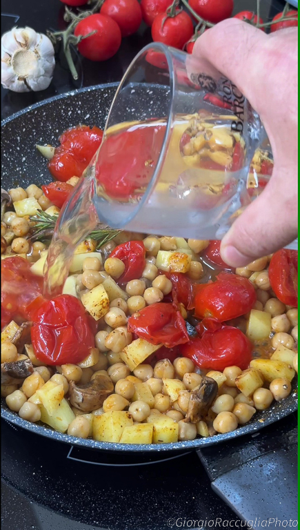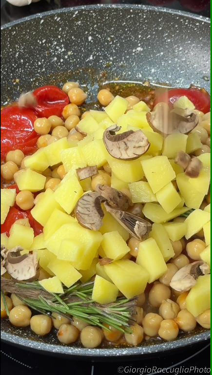 Los garbanzos, las patatas y los champiñones se unen en un abrazo de sabores rústicos y envolventes, enriquecidos por el aroma del romero y la nota ahumada del pimentón.