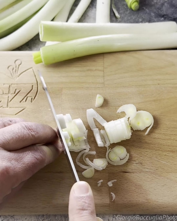 Para preparar la tarta salada con ricotta y cebollino, comienza cortando el cebollino en rodajas.