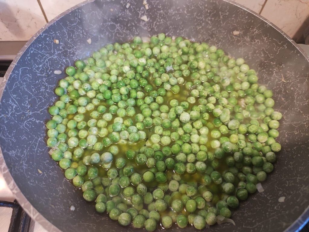 Después de un par de minutos, añade también los guisantes que acabas de pasar por el mixer y continúa la cocción.