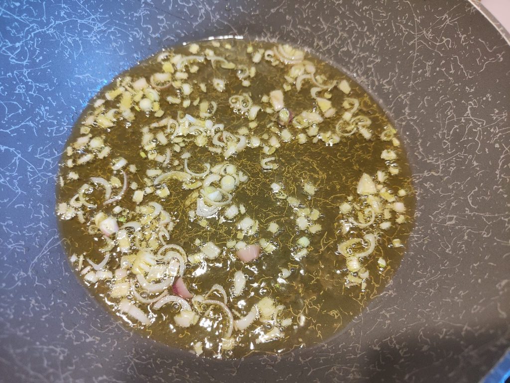 Pon a sofreír la chalota en abundante aceite de oliva virgen extra y, cuando empiece a ablandarse, añade los guisantes.