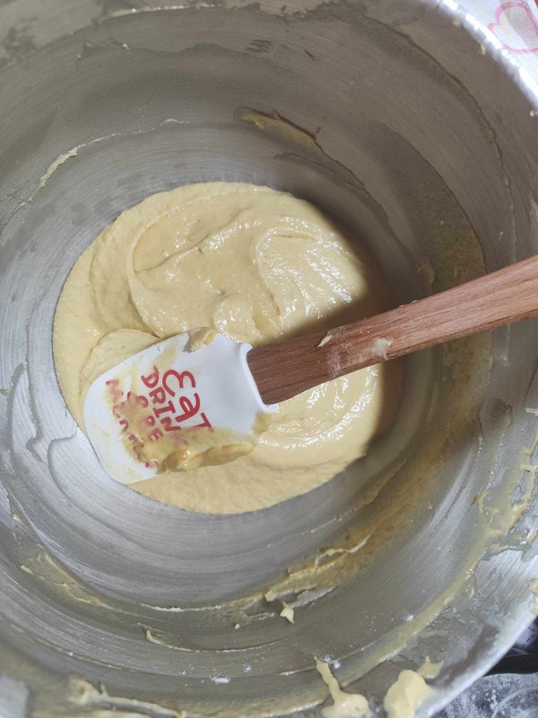 Montad el gancho de la batidora y comenzad a trabajar los ingredientes vertiendo poco a poco los huevos batidos.