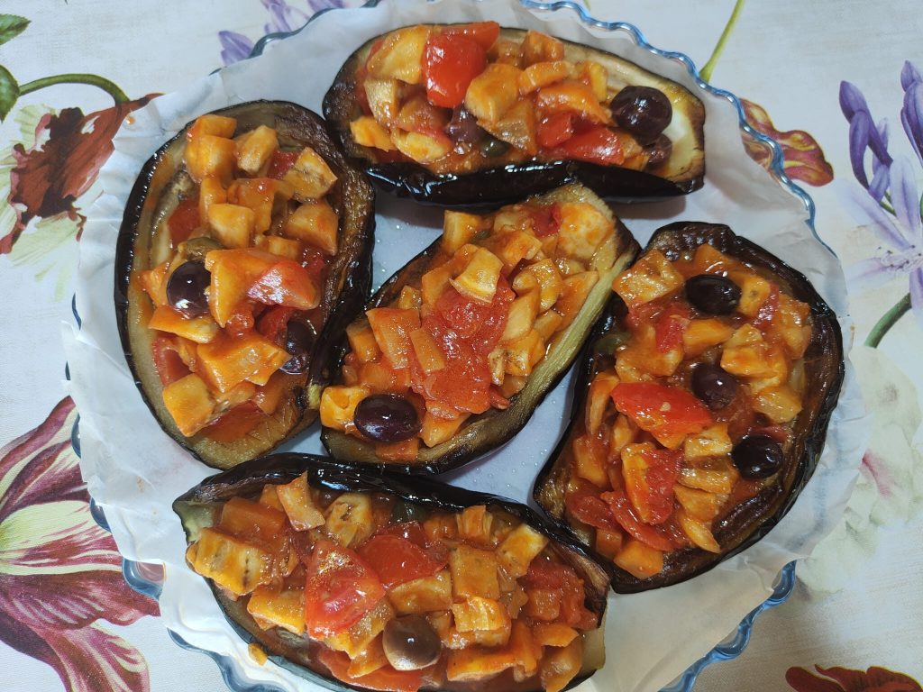 • Coloca ahora los cascos en una bandeja forrada con papel de horno, salpícalos ligeramente y rellénalos con la preparación a base de tomatitos, aceitunas y berenjena.