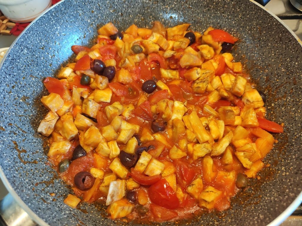 Os propongo la versión de la abuela Lina, la más clásica de las recetas que ve las berenjenas cortadas a la mitad, vaciadas y luego rellenas con la misma pulpa de las berenjenas, cortada en cubitos y salteada en sartén, tomatitos, aceitunas, alcaparras y queso o mozzarella y si os gusta también scamorza o provola. En este caso he utilizado un relleno adecuado también para vegetarianos, pero cada vez podéis probar a cambiarlo.