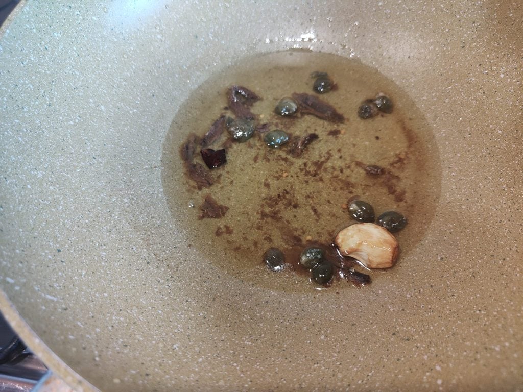 Calienta 3-4 cucharadas de aceite en una sartén antiadherente con 1/2 dientes de ajo machacados y pelados, la guindilla triturada y 4 filetes de anchoa en aceite.