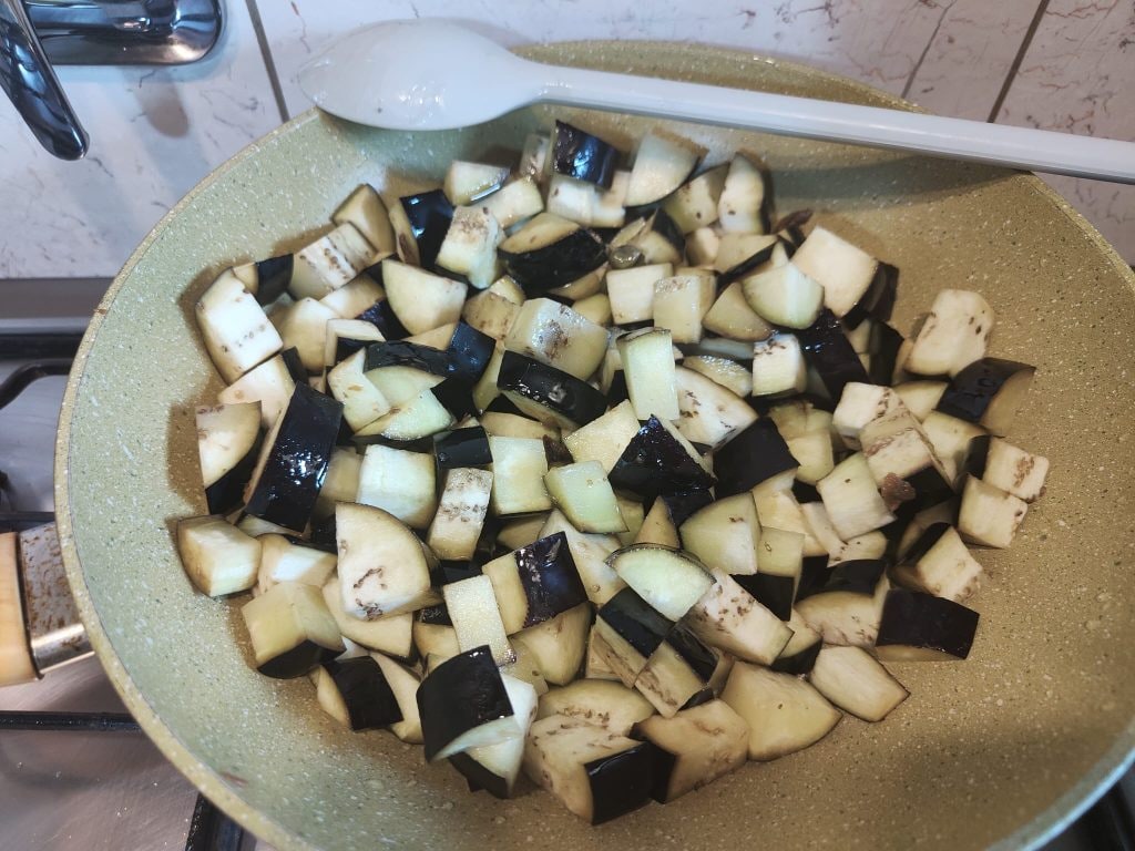 El secreto para un resultado perfecto está en el corte de las berenjenas: trozos pequeños más o menos del mismo tamaño. Esto favorecerá una fritura uniforme y dorada.