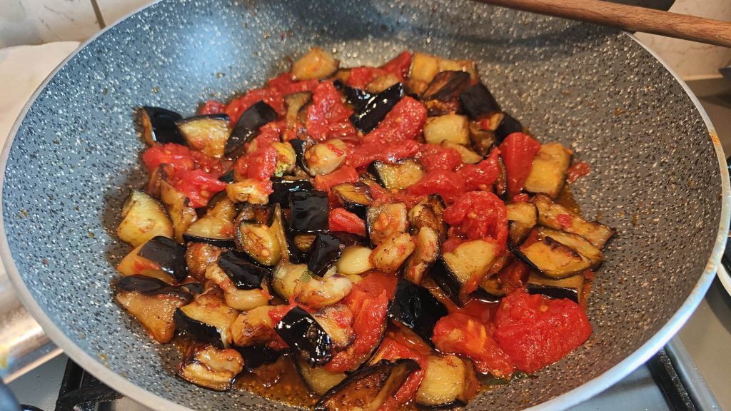 Cuando las berenjenas y los tomatitos estén bien cocidos, apaga el fuego, elimina el diente de ajo y perfuma al gusto con la albahaca fresca picada.